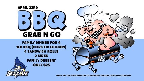 Support Seaside Christian Academy by purchasing a put together at home a pulled pork or chicken BBQ meal! Drive-Thru Pick Up at Seaside Christian Academy